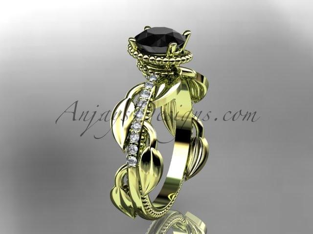 Unique 14k yellow gold diamond leaf and vine diamond engagement ring with a Black Diamond center stone ADLR231