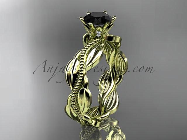 Unique 14k yellow gold leaf and vine engagement ring, wedding band with a Black Diamond center stone ADLR258
