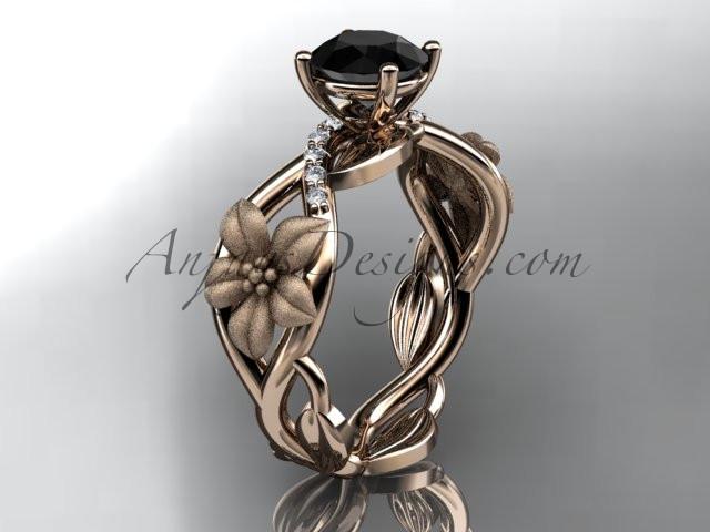 Unique 14kt rose gold diamond floral leaf and vine wedding ring, engagement ring with a Black Diamond center stone ADLR270