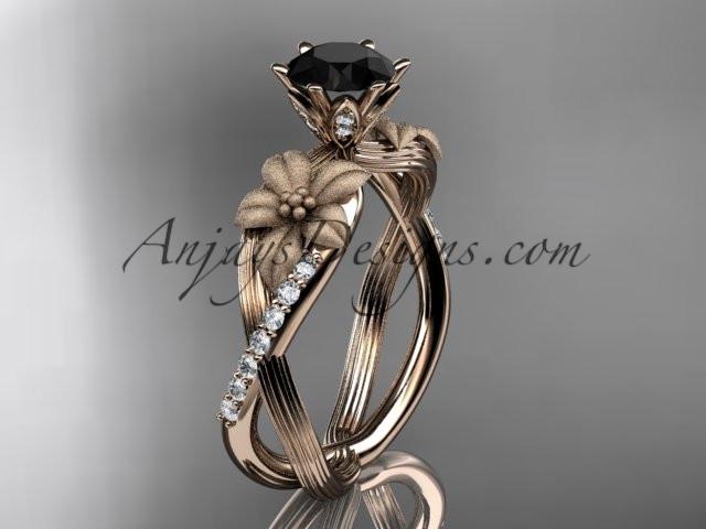 Unique 14kt rose gold diamond flower, leaf and vine wedding ring, engagement ring with a Black Diamond center stone ADLR221