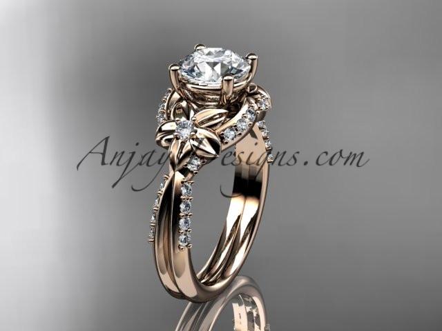 Unique 14kt rose gold diamond flower, leaf and vine wedding ring, engagement ring with a "Forever One" Moissanite center stone ADLR220