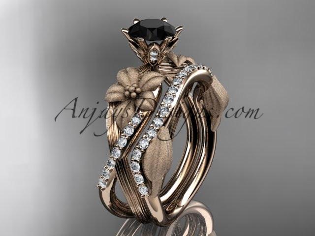 Unique 14kt rose gold diamond flower, leaf and vine wedding ring, engagement set with a Black Diamond center stone ADLR221S