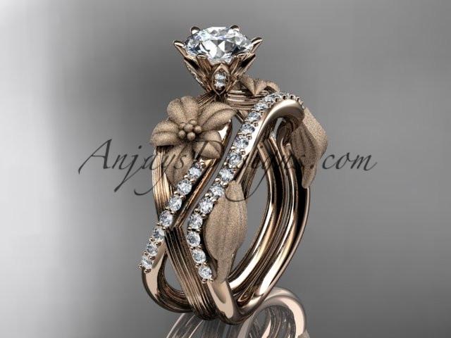 Unique 14kt rose gold diamond flower, leaf and vine wedding ring, engagement set with a "Forever One" Moissanite center stone ADLR221S