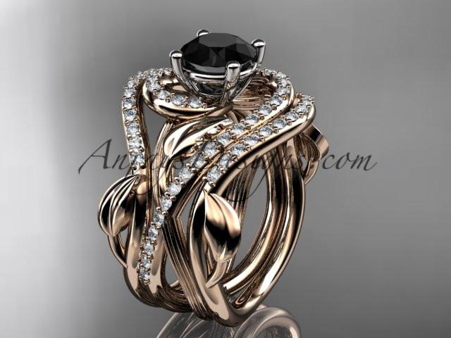 Unique 14kt rose gold diamond leaf and vine wedding ring, engagement ring with a Black Diamond center stone and double matching band ADLR222S