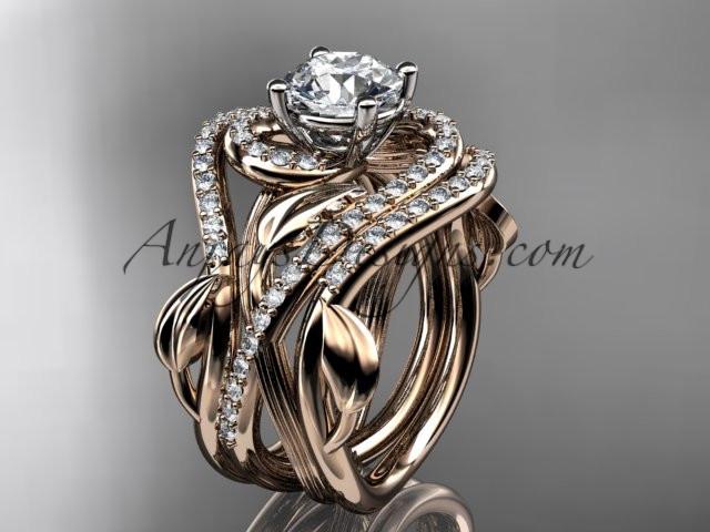 Unique 14kt rose gold diamond leaf and vine wedding ring, engagement ring with a double matching band ADLR222S