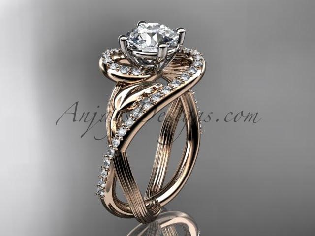 Unique 14kt rose gold diamond leaf and vine wedding ring, engagement ring with a "Forever One" Moissanite center stone ADLR222
