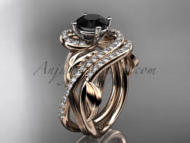 Unique 14kt rose gold diamond leaf and vine wedding set, engagement set with a Black Diamond center stone ADLR222S