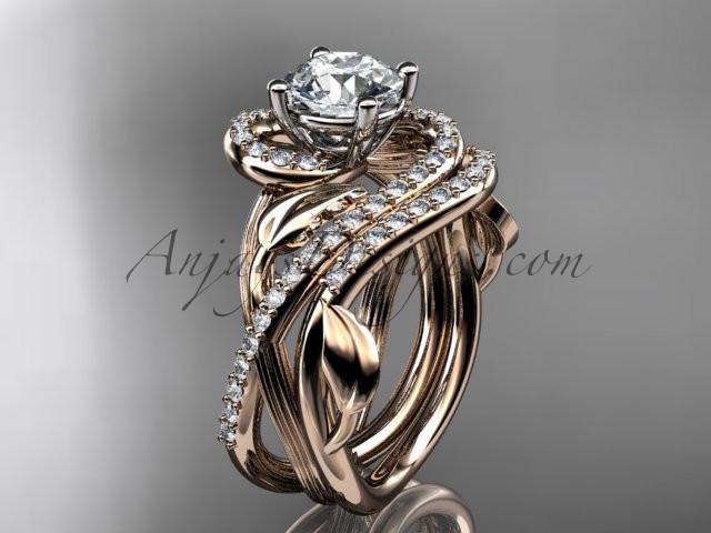 Unique 14kt rose gold diamond leaf and vine wedding set, engagement set with a "Forever One" Moissanite center stone ADLR222S