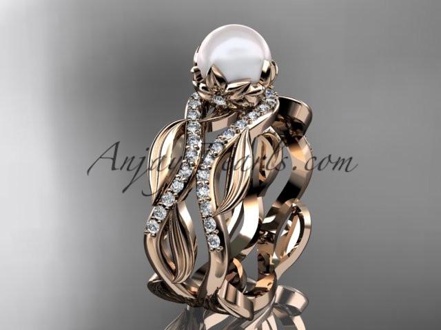 Unique 14kt rose gold diamond pearl floral leaf and vine engagement set AP264S