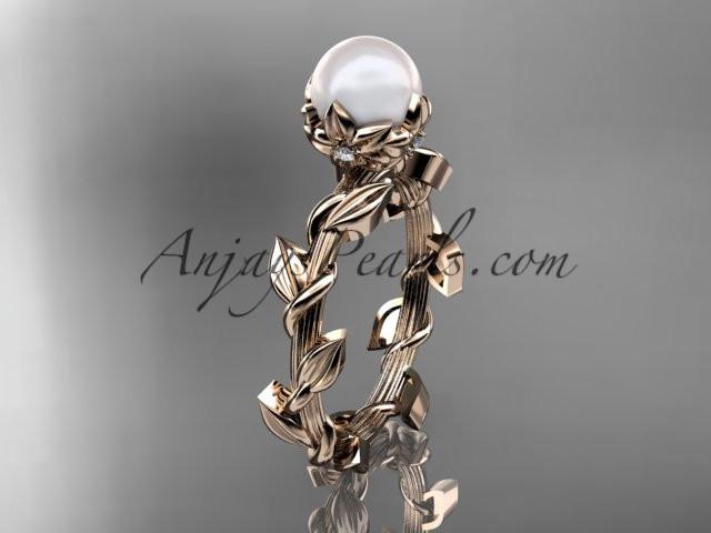 Unique 14kt rose gold diamond pearl leaf and vine engagement ring AP248