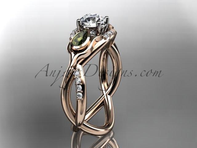 Unique 14kt rose gold diamond tulip flower, leaf and vine engagement ring with a "Forever One" Moissanite center stone ADLR226