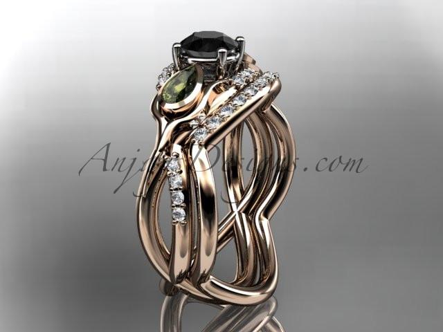 Unique 14kt rose gold diamond tulip flower, wedding set, leaf and vine engagement set with a Black Diamond center stone ADLR226S