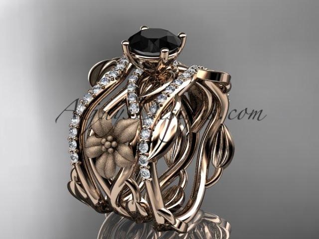 Unique 14kt rose gold floral diamond wedding ring, engagement ring with a Black Diamond center stone and double matching band ADLR270S