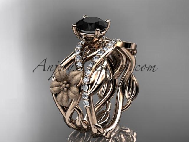 Unique 14kt rose gold floral diamond wedding ring, engagement set with a Black Diamond center stone ADLR270S