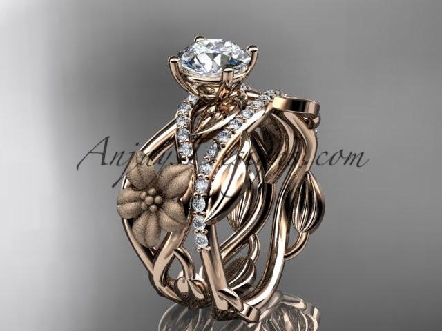 Unique 14kt rose gold floral diamond wedding ring, engagement set with a "Forever One" Moissanite center stone ADLR270S