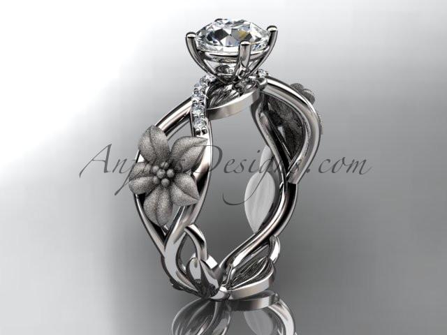 Unique 14kt white gold diamond floral leaf and vine wedding ring, engagement ring with a "Forever One" Moissanite center stone ADLR270