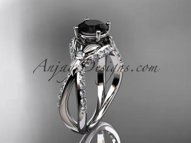 Unique 14kt white gold diamond flower, leaf and vine wedding ring, engagement ring with a Black Diamond center stone ADLR218