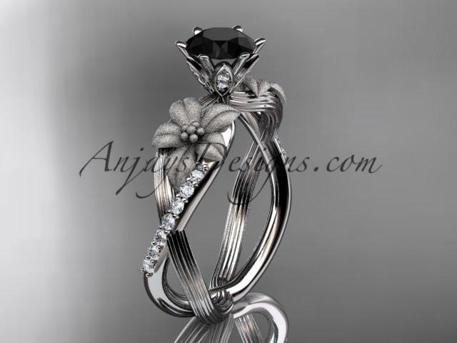 Unique 14kt white gold diamond flower, leaf and vine wedding ring, engagement ring with a Black Diamond center stone ADLR221