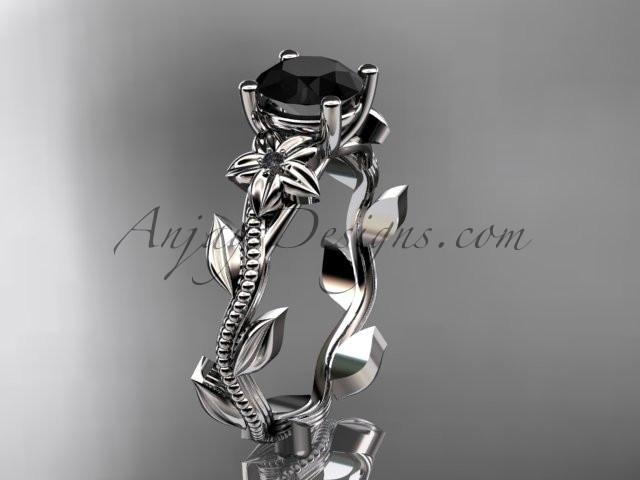 Unique 14kt white gold diamond flower, leaf and vine wedding ring,engagement ring with a Black Diamond center stone ADLR238