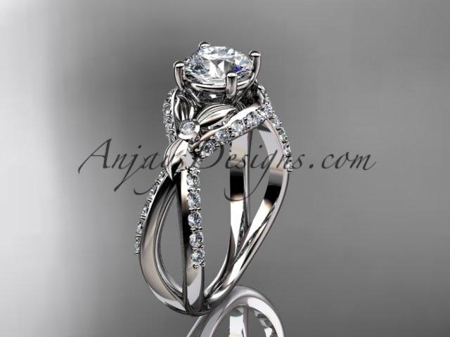Unique 14kt white gold diamond flower, leaf and vine wedding ring, engagement ring with a "Forever One" Moissanite center stone ADLR218