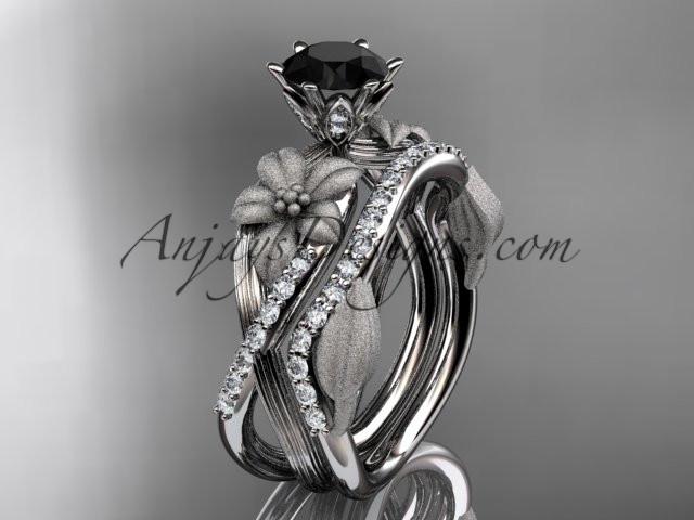 Unique 14kt white gold diamond flower, leaf and vine wedding ring, engagement set with a Black Diamond center stone ADLR221S