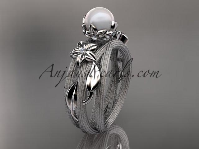 Unique 14kt white gold diamond leaf and vine pearl engagement ring AP253