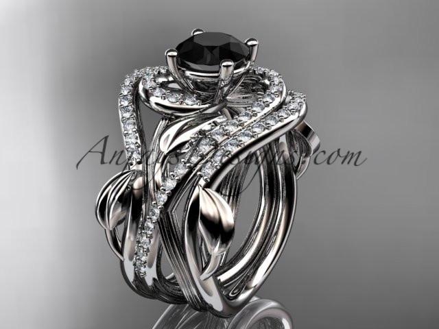 Unique 14kt white gold diamond leaf and vine wedding ring, engagement ring with a Black Diamond center stone and double matching band ADLR222S
