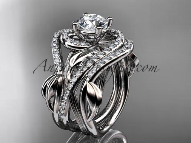 Unique 14kt white gold diamond leaf and vine wedding ring, engagement ring with a "Forever One" Moissanite center stone and double matching band ADLR222S
