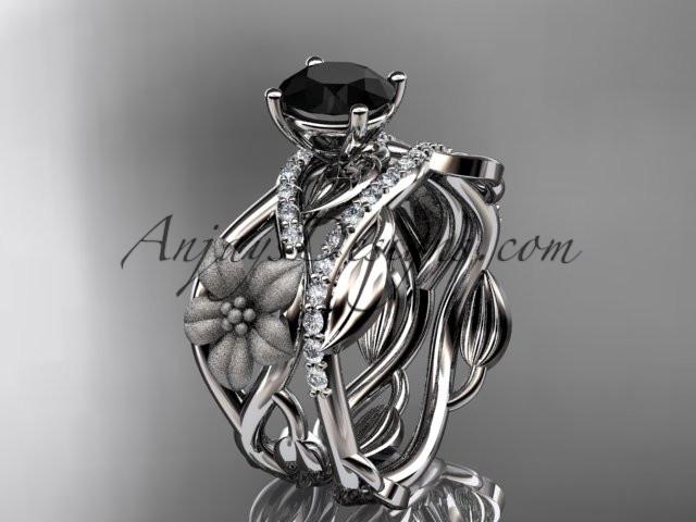 Unique 14kt white gold floral diamond wedding ring, engagement set with a Black Diamond center stone ADLR270S