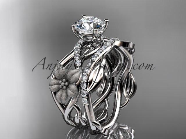 Unique 14kt white gold floral diamond wedding ring, engagement set with a "Forever One" Moissanite center stone ADLR270S