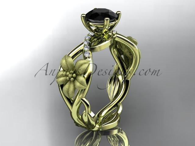 Unique 14kt yellow gold diamond floral leaf and vine wedding ring, engagement ring with a Black Diamond center stone ADLR270