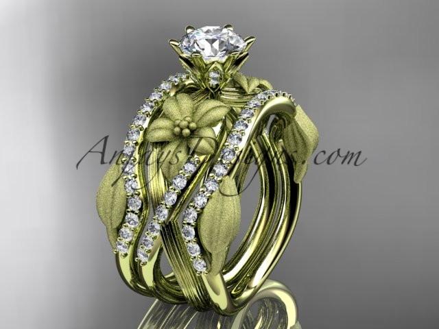 Unique 14kt yellow gold diamond flower, leaf and vine wedding ring, engagement ring and double matching band ADLR221S