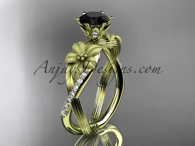 Unique 14kt yellow gold diamond flower, leaf and vine wedding ring, engagement ring with a Black Diamond center stone ADLR221