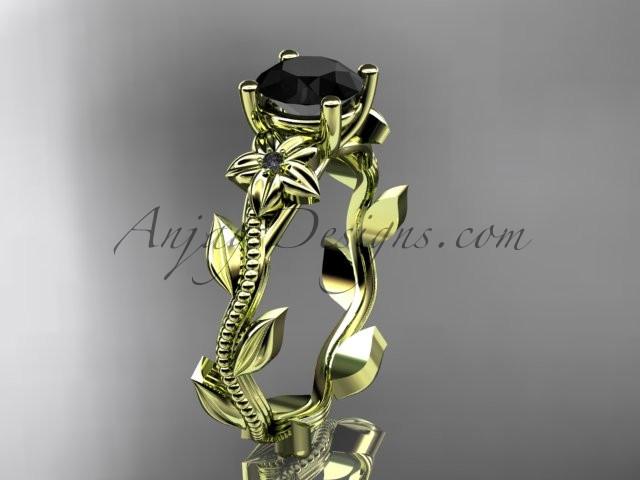 Unique 14kt yellow gold diamond flower, leaf and vine wedding ring,engagement ring with a Black Diamond center stone ADLR238