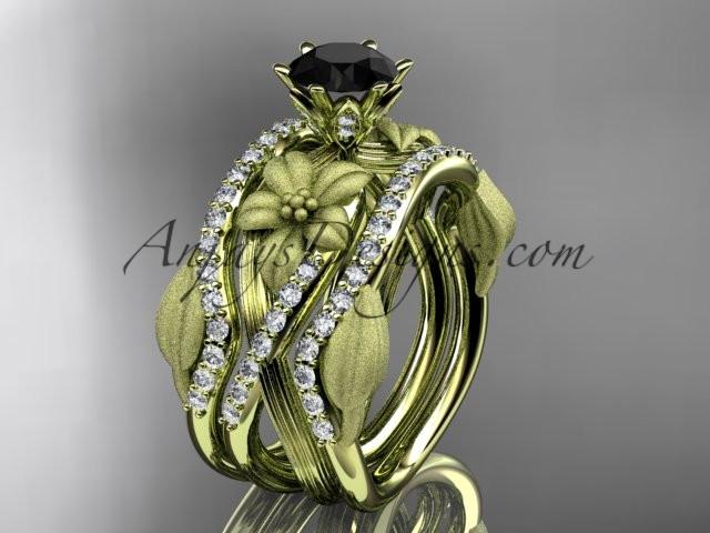 Unique 14kt yellow gold diamond flower, leaf and vine wedding ring, engagement ring with a Black Diamond center stone and double matching band ADLR221S