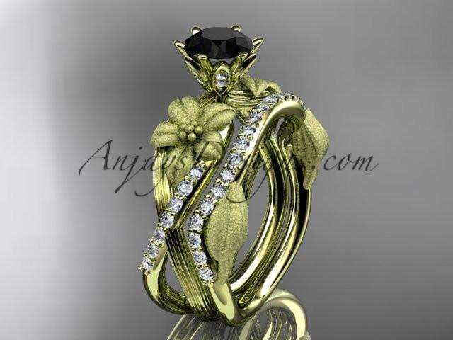 Unique 14kt yellow gold diamond flower, leaf and vine wedding ring, engagement set with a Black Diamond center stone ADLR221S