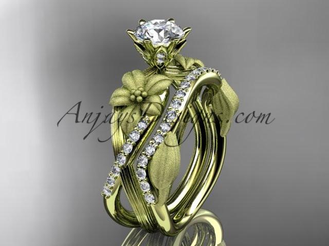 Unique 14kt yellow gold diamond flower, leaf and vine wedding ring, engagement set with a "Forever One" Moissanite center stone ADLR221S