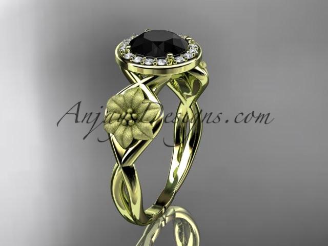 Unique 14kt yellow gold diamond flower wedding ring, engagement ring with a Black Diamond center stone ADLR219