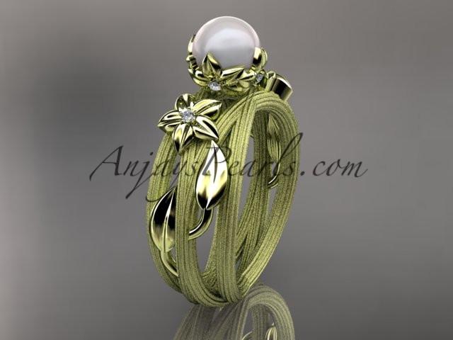 Unique 14kt yellow gold diamond leaf and vine pearl engagement ring AP253