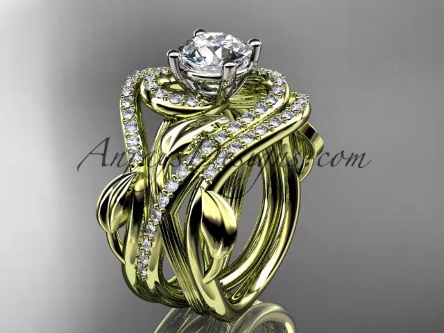 Unique 14kt yellow gold diamond leaf and vine wedding ring, engagement ring with a "Forever One" Moissanite center stone and double matching band ADLR222S