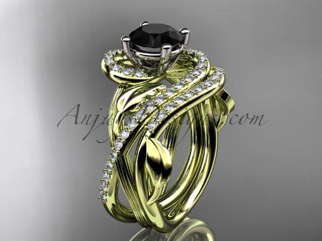 Unique 14kt yellow gold diamond leaf and vine wedding set, engagement set with a Black Diamond center stone ADLR222S