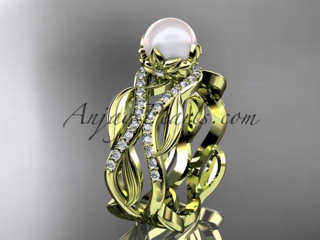Unique 14kt yellow gold diamond pearl floral leaf and vine engagement set AP264S