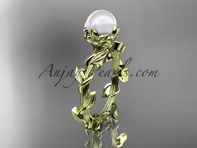 Unique 14kt yellow gold diamond pearl leaf and vine engagement ring AP248