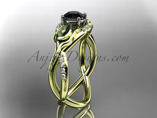 Unique 14kt yellow gold diamond tulip flower, leaf and vine engagement ring with a Black Diamond center stone ADLR226